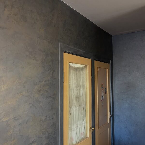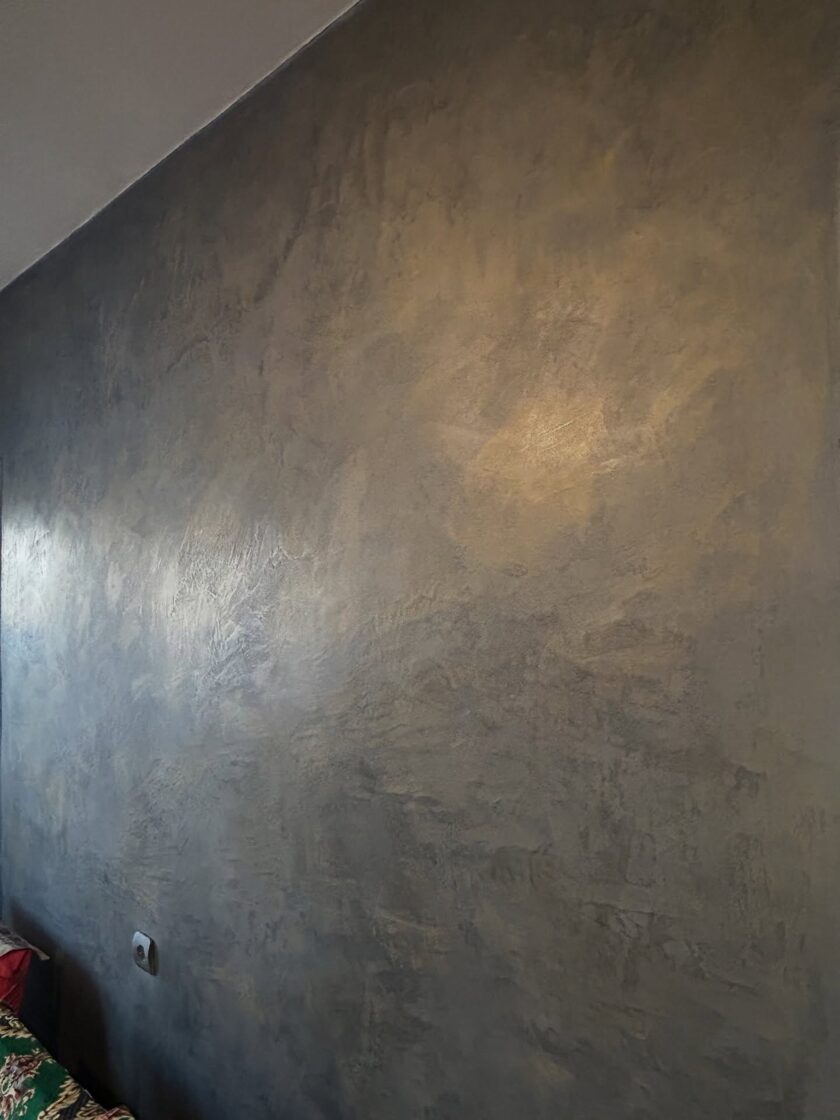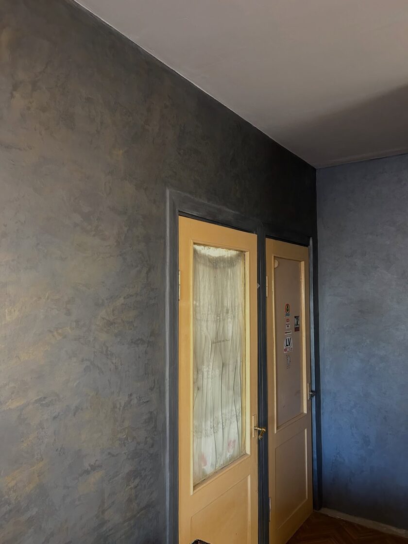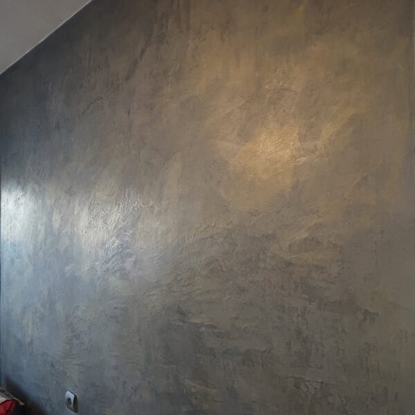Metāla imitācijas sienai pa pamatu tika izmantota dekoratīvā zīda krāsa, kura tika slīpēta, tad pievienoti metāla efektam pigmenti esošajā sastāvā. Tad slīpēts, pulēts un tad iestrādāts metāla pulvers ar vasku. Virsma ir mitrum droša.