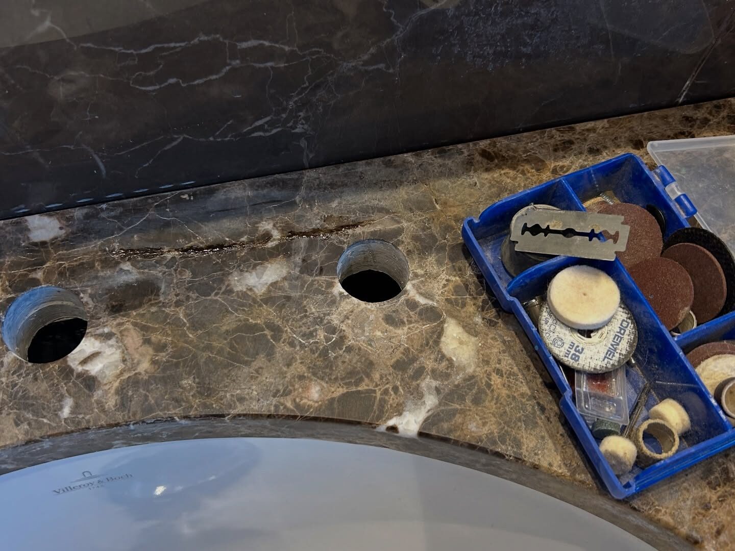 - Būtiski instrumenti un materiāli plaisu novēršanai marmora darba virsmā ir epoksīds un hermētiķi, kas paredzēti akmens virsmām, špakteles nazis, smalkgraudains smilšpapīrs, mīkstas drānas un marmora pulēšana.