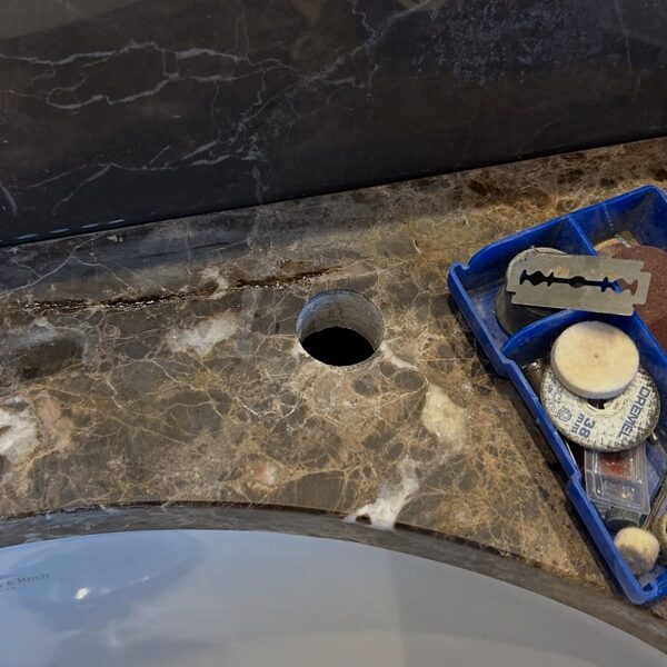- Izpildiet soli pa solim, lai novērstu plaisu marmora darba virsmā, notīrot zonu, uzmanīgi uzklājot epoksīdu, ļaujot tam pilnībā sacietēt un pulējot virsmu, lai iegūtu nevainojamus rezultātus.
